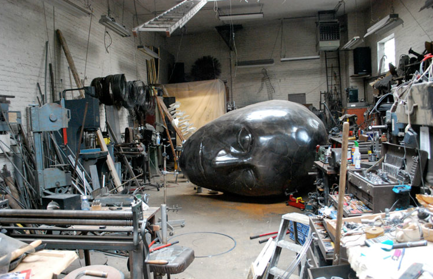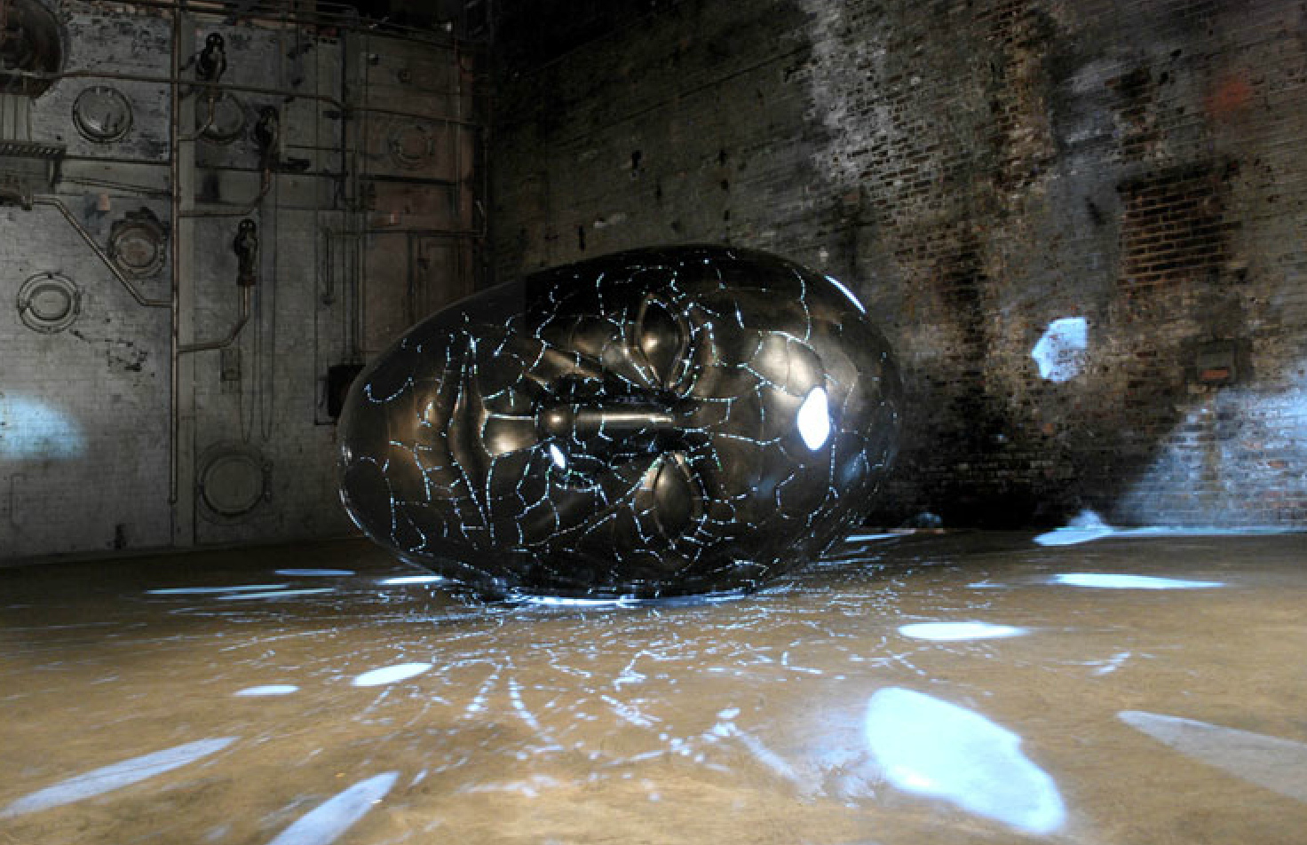 10' x 8' steel, glass, motor, strobe light, urethane rubber, paint